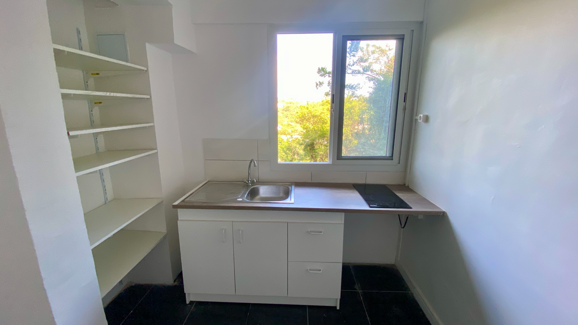 Ce studio lumineux offre une vue dégagée sur la montagne et la verdure, apportant une atmosphère paisible et ventilée.