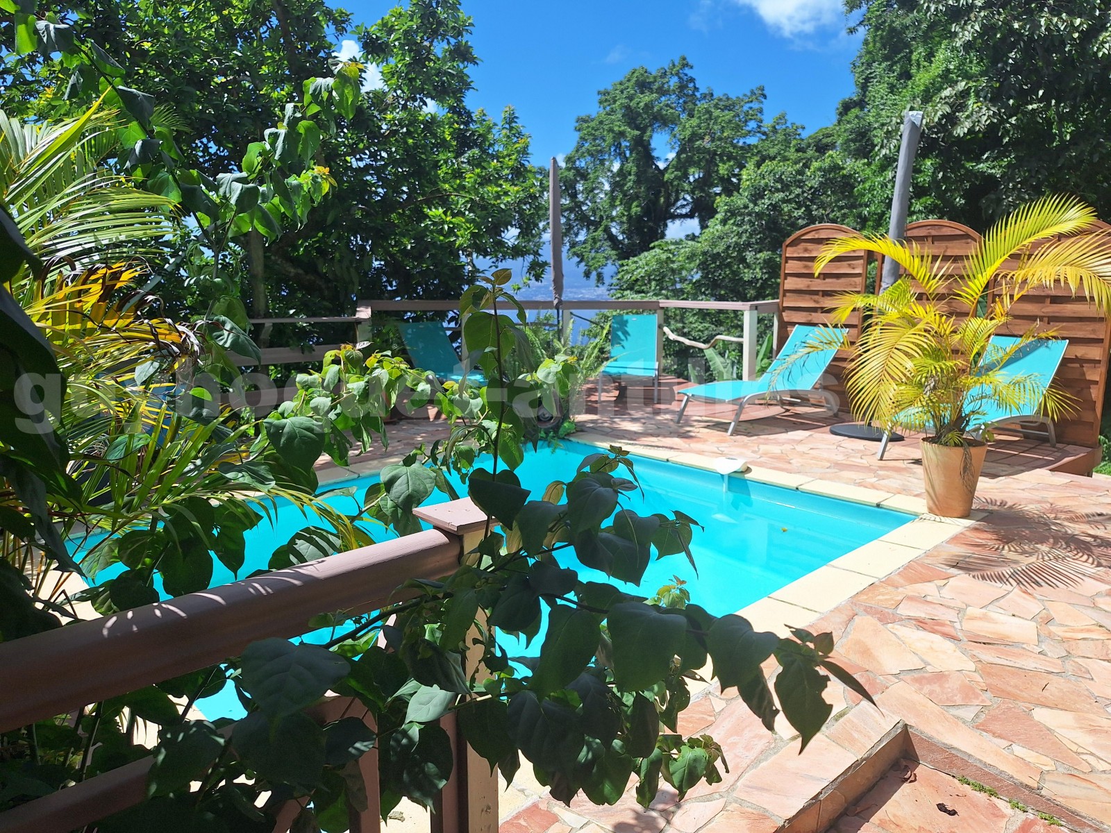 Magnifique villa de type 3 vendue entièrement équipée et meublée sur terrain arboré de 1356m² avec piscine et vue mer époustouflante.