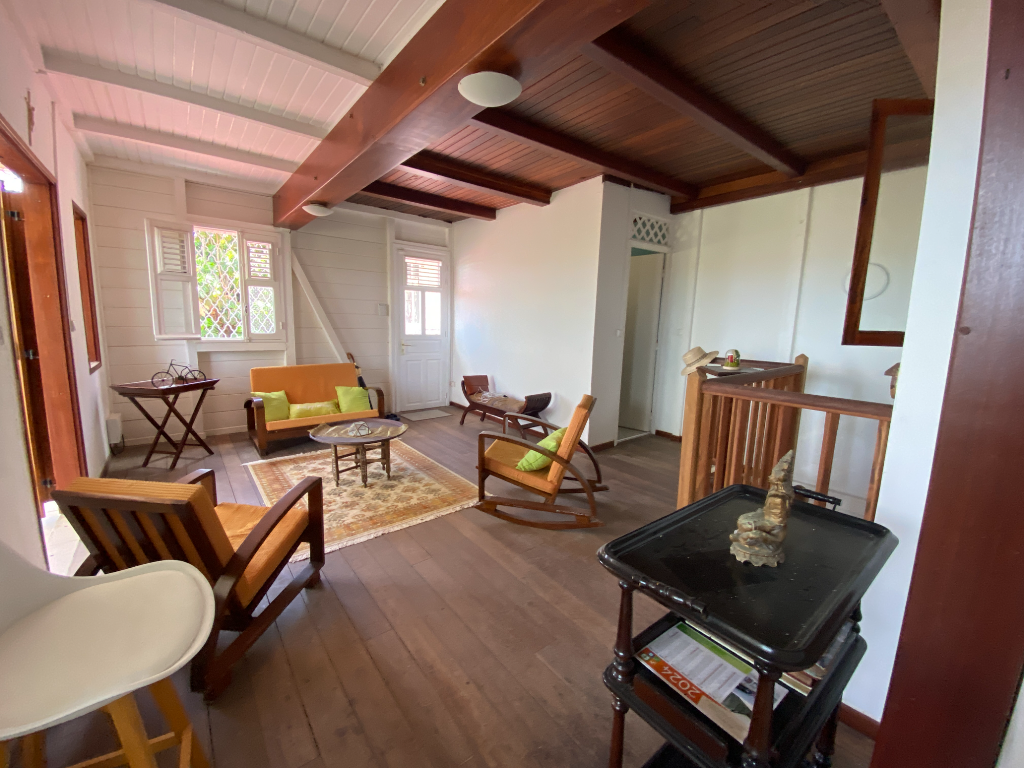 Étage : un second séjour, deux chambres, une salle d’eau avec WC, et une terrasse panoramique avec une vue époustouflante sur la baie de Fort-de-France.