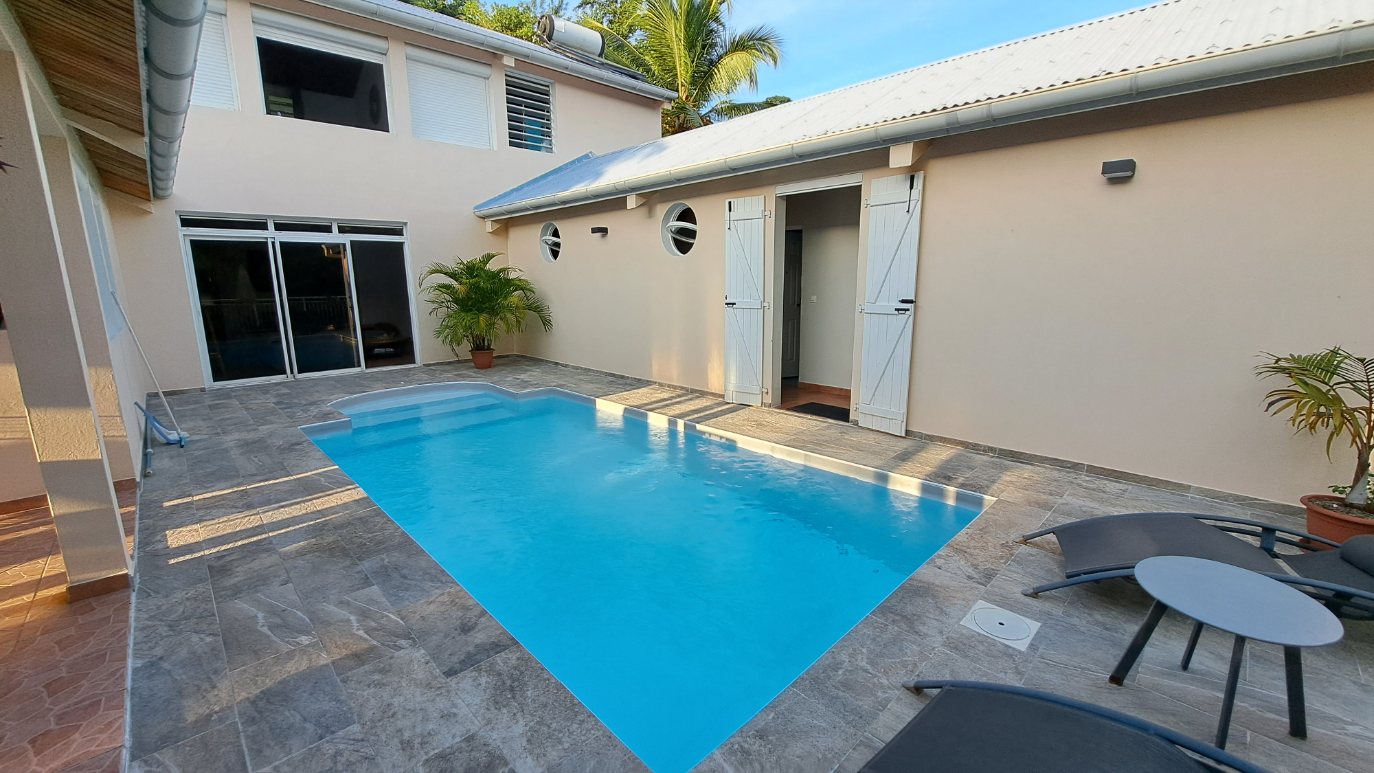 autour d’une piscine, créant un véritable cœur de maison à