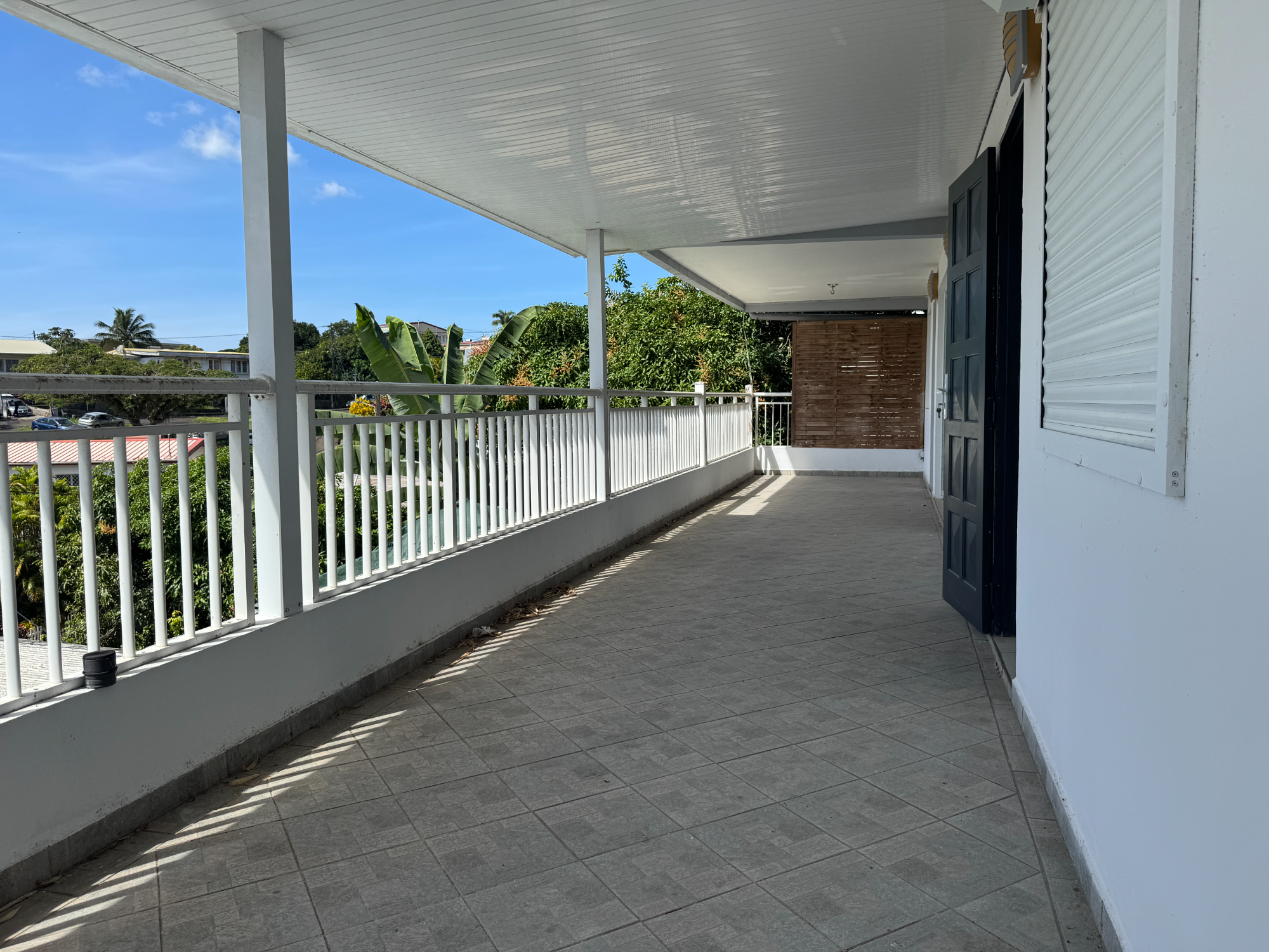À l’extérieur, une belle terrasse spacieuse bénéficie d’une agréable vue dégagée avec une petite vue mer ainsi qu’une vue sur le Fort (Fort Saint Louis) de Fort-de-France, apportant une touche supplémentaire de charme et d’évasion au quotidien.